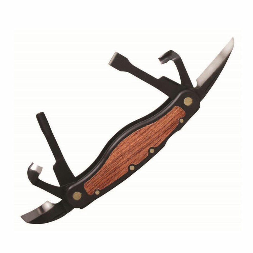 4 1/4" closed six-blade multi-tool with two scoops, a straight gouge, a hook, a chisel, and a detail blade. Blades lock in open or closed position. Black aluminum handles with wood inlay. Kit also includes Flex cut Slip strop, Flex cut gold polishing compound, and tan leather belt sheath. Hang packaged. Flex cut carving tools are a new breed of wood carving tools created to address the needs of the modern hobbyist and professional. Designed by woodcarvers for woodcarvers, flex cut features flexible blade shafts with razor-sharp cutting edges to give woodcarvers maximum control over each cut.
