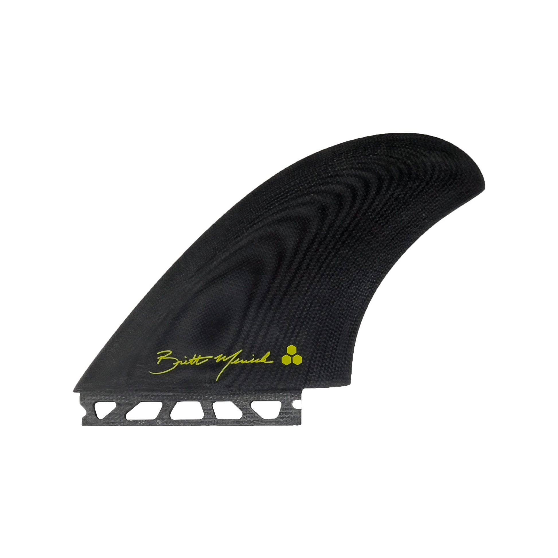 Britt Merrick’s hand foiled signature twin fin set is designed to fit between a traditional upright and keel fin. While conceived to maximize the performance and flow of the new CI Twin Pin, the setup works great in any twin fin board when you are looking for the perfect combination of drive, hold, and release. Dimensions: Depth | 5.31". Base | 5.77”. Area | 23.58 sq in