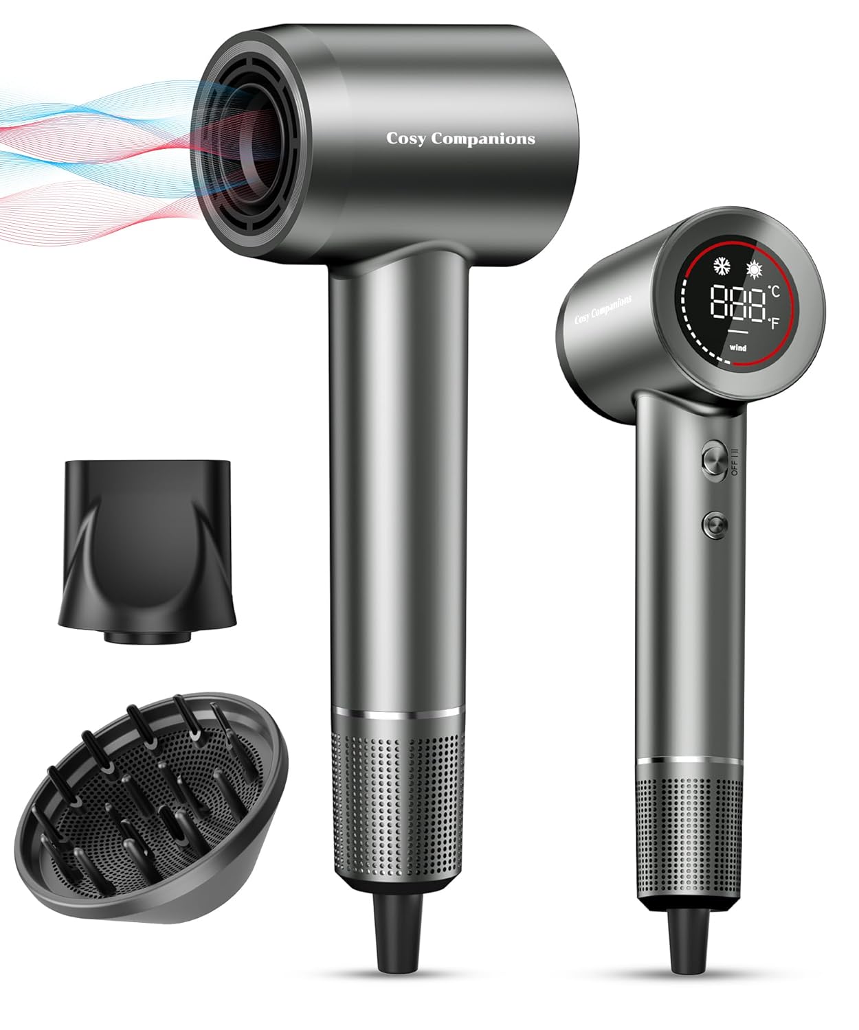 Ultra-Fast Drying: Cosy Companions hair blow dryer is equipped with a 150000 RPM high-speed brushless motor and the wind speed up to 36 m/s, which strong airflow can dry your hair in a short time and is 5x faster than traditional hair dryers.