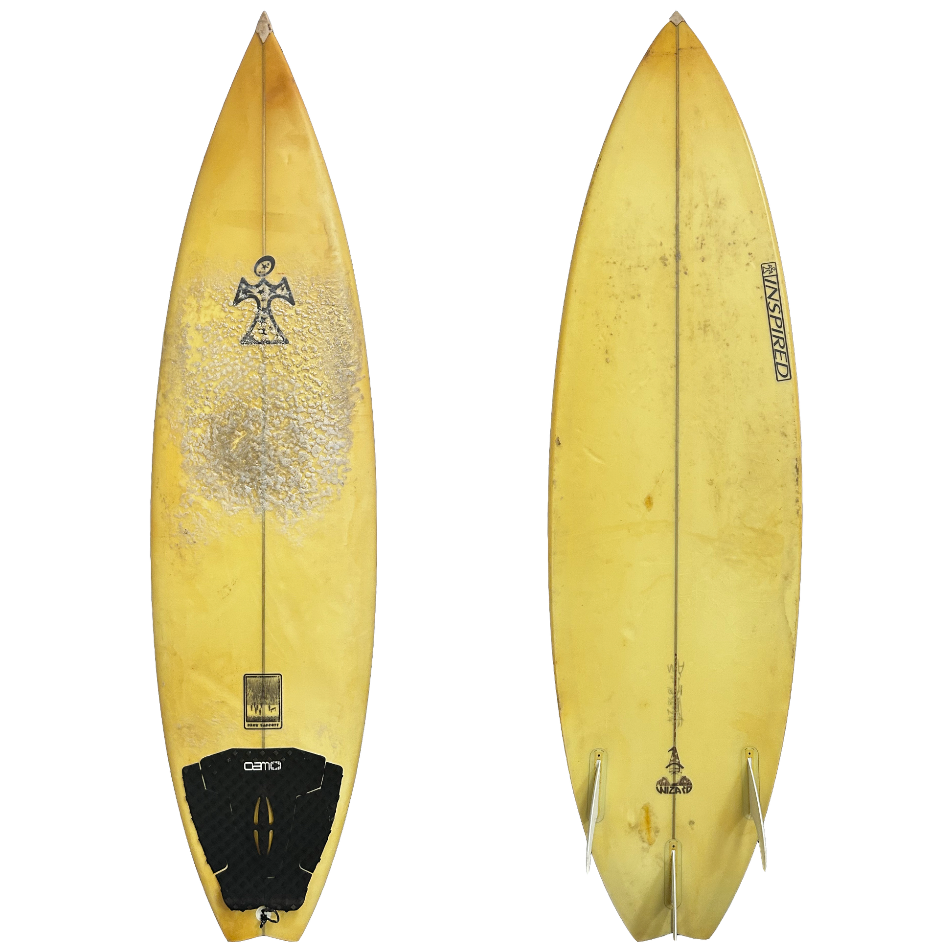 The Inspired Wizard 5'11 Consignment Surfboard in alright condition with a few pressure dings along the deck and a few pressure dings along the bottom. There are a few ding repairs made along the rails and on the bottom of the board as well. There’s also a couple cracks/dings in the glassing along the rails but it looks like it would be a simple fix. There are some scratches/stress fractures in the glassing too.