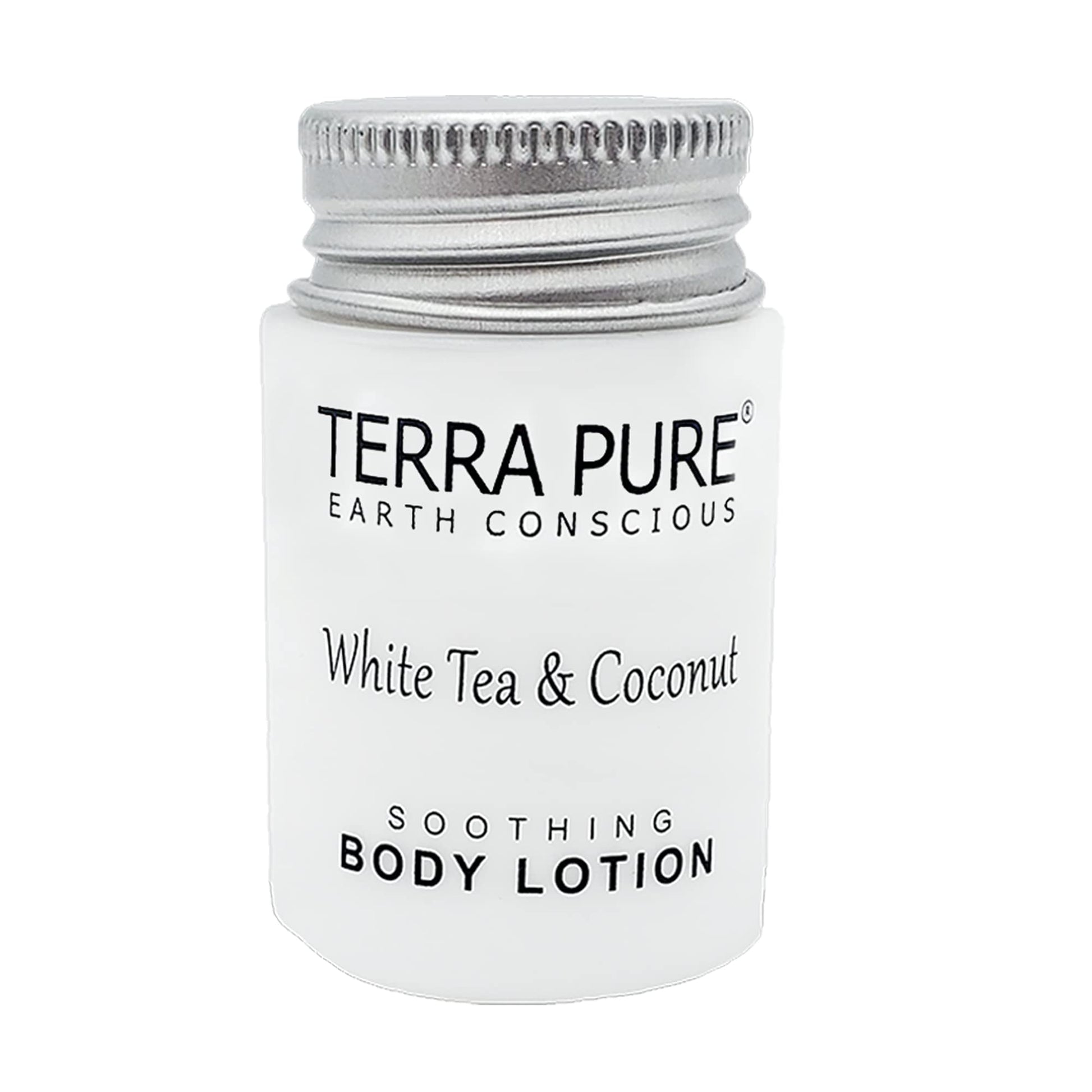 - Terra Pure White Tea & Coconut Lotion, ideally designed and packaged for use in Hotel, VACATION RENTAL (AirBnB &VRBO), Motel, Bed and Breakfast, Guest Room, and more to provide GREAT LOOKING hospitality service.